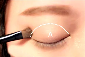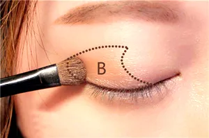 8、然后用珠光浅咖色扫在眼皮图示部分。