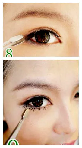 STEP7:用镊子紧贴自己的睫毛根部,从中间位置开始粘贴,然后再粘贴眼头位置。