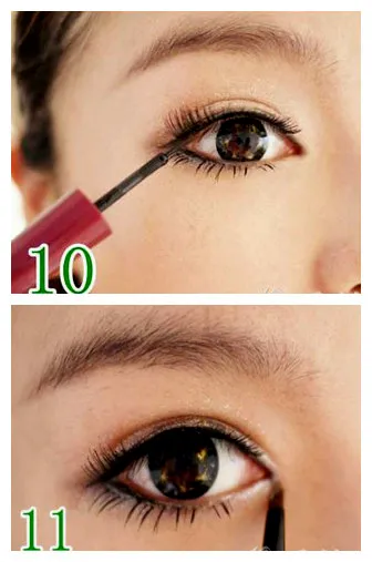 STEP9:粘贴好后,用黑色的眼线液在下眼睑的位置画上一笔,填补好假睫毛和自己睫毛的缝隙。