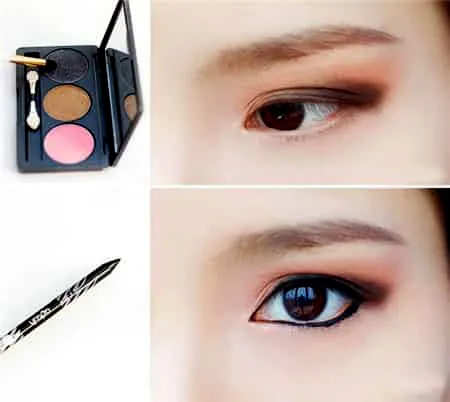 STEP 4:接着用棕红色的眼影围着眼线做晕染,将黑色眼线晕开之后,烟熏妆就成功了一半。