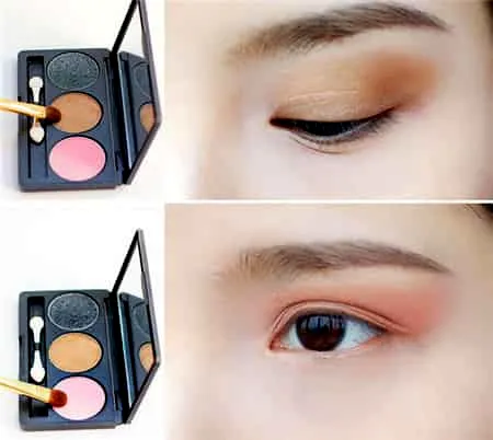 STEP 2:先用浅棕色的眼影在眼皮上打底,大范围扫开,接着用粉红色的眼影铺在棕色眼影上方,如果直接用粉色眼影会显得浮肿,有了棕色眼影的衬托,还增加了眼部的深邃感。