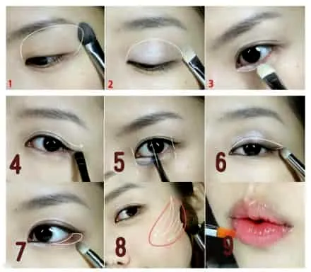 step7、8、9:下眼脸从眼中的位置,前与白色眼影衔接,后于上眼影眼尾衔接,最后在苹果肌刷上粉扑,涂上唇蜜,整款妆容就完成了。