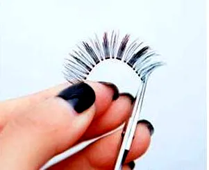 Step5:用小剪刀去掉假睫毛多余的部分,然后在透明梗上涂抹睫毛胶,再捏住两头两尾,弯曲睫毛保持几秒钟,让它更加柔软,更好佩戴,更加贴合**眼睛弧度。