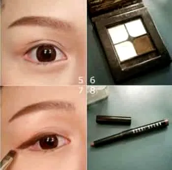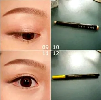 Step2:指腹蘸取少量的珍珠色眼影在眼头打量,顺便带过卧蚕的地方,让眼睛更饱满。选择深色眼影膏顺着睫毛根部勾画眼线,根据自己的眼型进行修改。眼睛比较圆的女生稍微加长眼线,眼睛比较长的女生只需要加粗眼线中段即可。