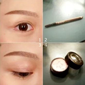 Step1:想要让化妆的感觉比较轻薄,每个步骤下手都要轻。这里选择深棕色眉笔沿着眉毛勾画眉形,然后借助眉粉填补完成,让眉毛自然有型。选择带浅粉色珠光的眼影膏轻轻打底,接下来上眼影才会比较显色。