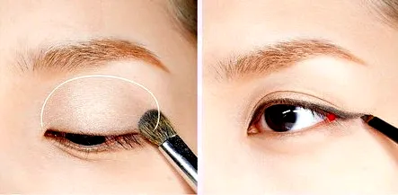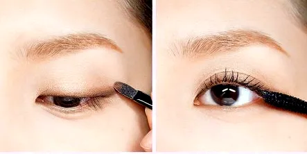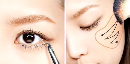 步骤3:将带有珠光的深棕色的眼影顺着睫毛根部画出一条眼线,可使眼线变的更加柔和,也有放大双眼的效果。