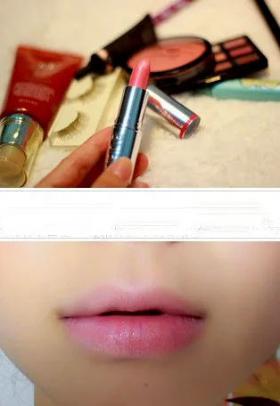 Step6:腮红部分选择一个淡橘色的腮红,轻扫在笑肌上,再用刷子轻轻均匀的粉刷好,打上高光,让妆容变得刚加立体一些,再是唇彩的部分选择粉嫩的浅粉色唇膏,粉嫩又甜美的淡妆就完成了。