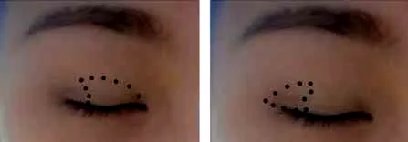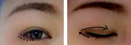 步骤8:用眼影刷沾3号眼影,沿着眼睛的双眼皮褶皱画出一条眼线,在下眼睑处的1/3处也画出一条细细的眼线。