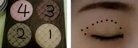步骤4:准备好四色眼影,然后使用1号香槟色的眼影进行眼窝打底。