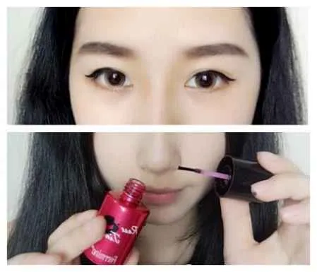 STEP3:眼线用液体的比较好,因为不容易脱落,而且比较持久,眼尾稍微上翘就可以了,很简单,唇彩选择大红色,涂抹均匀就完成了。