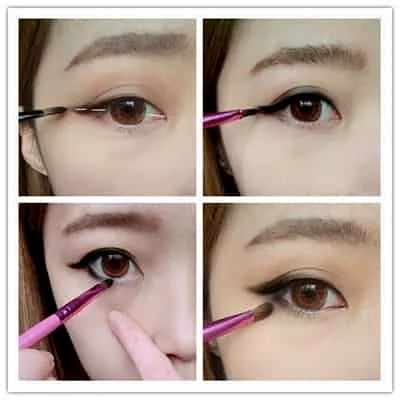 8、再用深棕色眼影上眼线和眼尾段进行混合晕染。