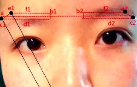 确定点e1和e2。也就是眉峰位置。通常眉尾和眼珠外围在同一条直线上并经过鼻翼。