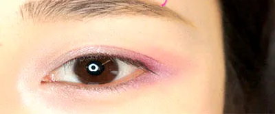 步骤二:用粉色打底,涂抹在整个眼窝和眼头,浅粉色涂抹在上眼皮和下眼角处;