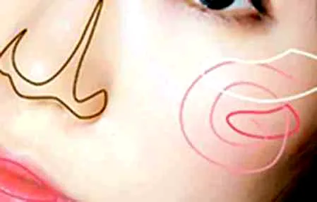 步骤8:最后是阴影和高光、腮红的涂抹,白**域是高光部分、棕色部分是阴影、粉色部分是腮红,按图分布分别画出妆感。