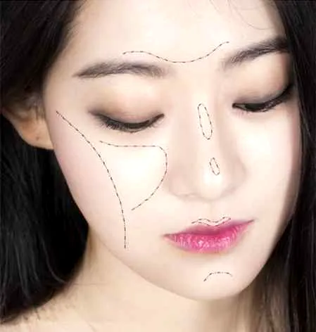 Step7:在鼻梁、额头、脸颊等地方(如图所示)涂上高光粉,在双唇位置均匀的涂抹上粉色系的口红即可。