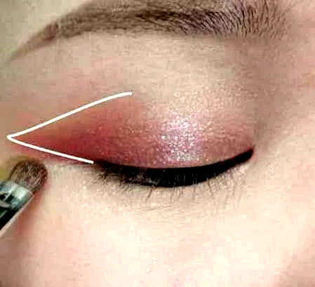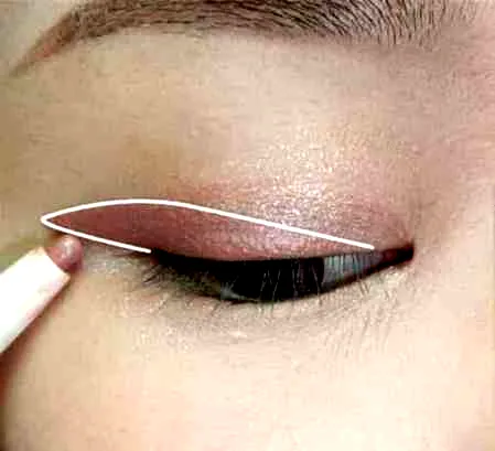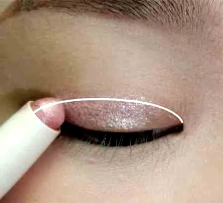 将高光眼影与唇彩混合,得到一款粉棕色眼影。并且涂在眼窝的后三分之一处,延长200px左右。