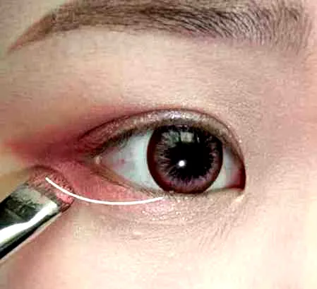 再将眼线膏涂在下眼线结膜处,控油粉饼用刷子扫在眼下,防止晕妆。