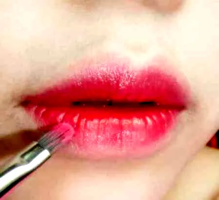 唇部涂上粉色口红,用唇刷向周围晕染开。用深红色口红再次涂在嘴唇**,再次用唇刷将刚刚涂抹的位置边缘小面积晕染开。