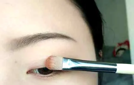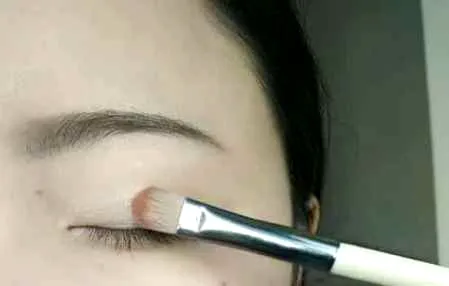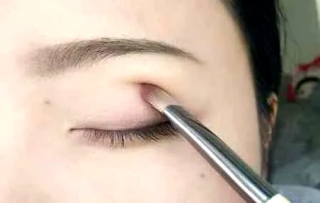 步骤四:眼影的部分先用浅粉色珠光眼影打底整个眼窝, 下眼睑的地方也要微微带过,这样显的眼睛比较有神。但是一点点就好。