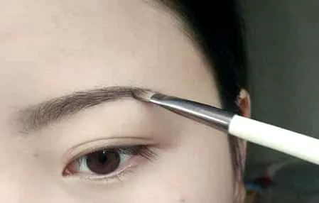 步骤三:纯黑色的眉毛会稍微显凶,所以我们再用深棕色的眉粉描一下眉毛,一来是淡化点眉色,二来也是使眉毛更细致,填补刚才没有化到的地方。