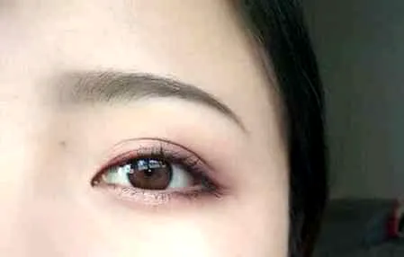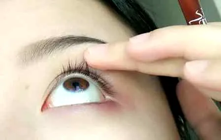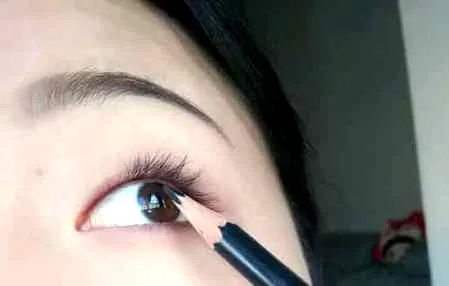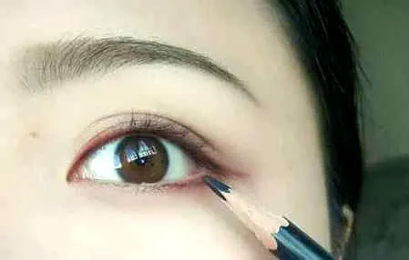 步骤八:接着在刚才的红色内眼线上再上一层黑色眼线。方法和刚才的一样。因为要化黑色眼线,所以之前的红色眼线要化粗一点,可以微微化出一点外眼线的感觉。