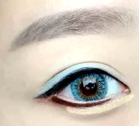 用棕色眼线笔画眼线,上眼线眼尾拉长5mm,然后用指甲向外拉出尖尖的尾端。下内眼睑处用白色眼线笔或眼影笔画白。