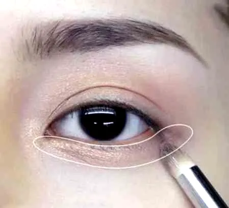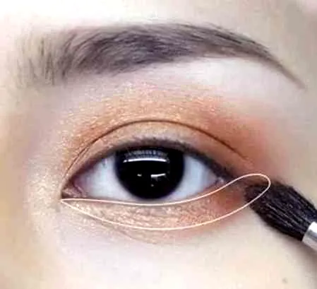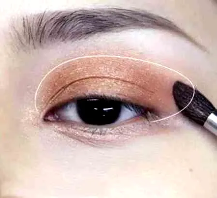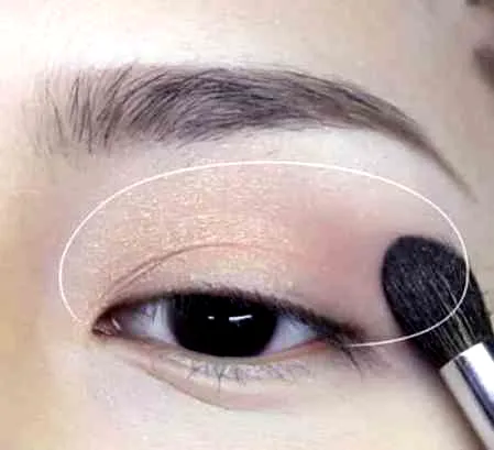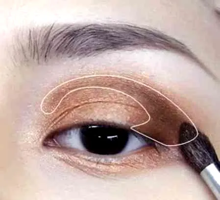 第五步:使用比基础色稍微暗一些的铜棕色阴影涂抹眉棱的一半部分,从双眼皮线开始**涂抹后,越到眉棱的部分渐渐自然地减少**,请注意不要覆盖基础**域。