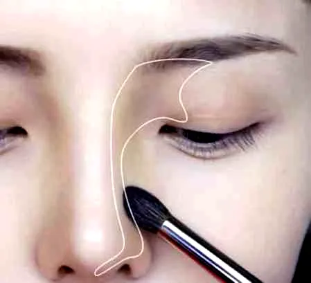 第一步:使用无珍珠亮片且少量红色的棕色阴影,从眼睛前段开始顺着鼻梁刷上阴影,选择切割与材质比较柔和的刷子,从眉棱**开始刷下,让阴影变得自然。