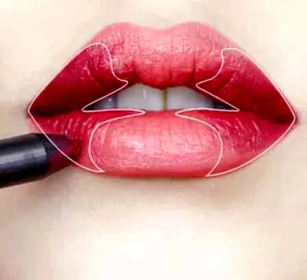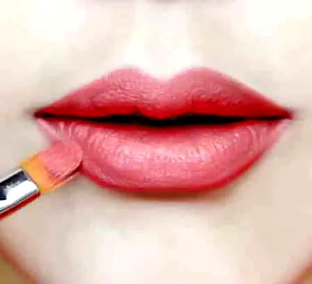 第十三步:用无珍珠的紫红色唇笔或眼线笔,从嘴角开始向**涂抹,请注意不要涂抹嘴唇**。