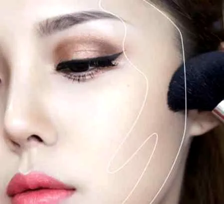第十一步:使用无珍珠亮片且只含少量红色的棕色阴影将脸颊的外部轮廓化,脸颊下面的阴影线角度应向嘴角度倾斜。
