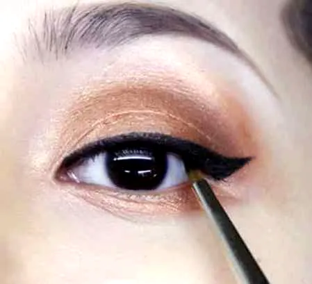 第八步:利用黑色眼线胶笔画眼线,用另一只手的小拇指轻轻按住眉棱后,从黏膜部分开始填充,像画睫毛一样将上方眼线完成。然后画上眼尾,眼尾稍微向上挑起来,稍微粗一点,敏捷一点画上眼尾。