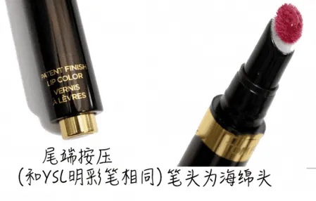 这款唇膏是按压海绵头的设计,使用时按压尾端,唇液就会从笔头的海绵头渗出,这样的海绵头设计目前只有TF拥有。唇膏奔上,光泽闪亮度高,滋润饱满,持久轻薄,但遮唇色效果不错,90%能被遮住。