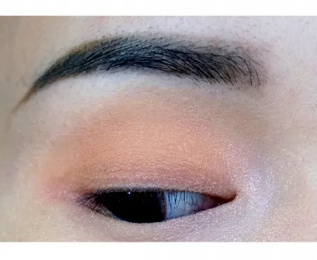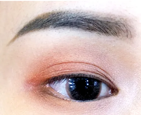 第一步:用海绵棒沾浅橘色眼影,晕染在整个上眼皮,注意用量少量多次。