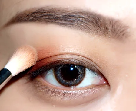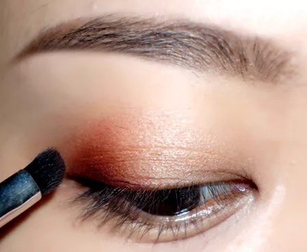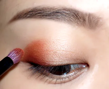 第三步:火苗刷沾取红棕色眼影,将刚刚画的眼尾三角的深色晕染开,先不用管边缘自不自然。