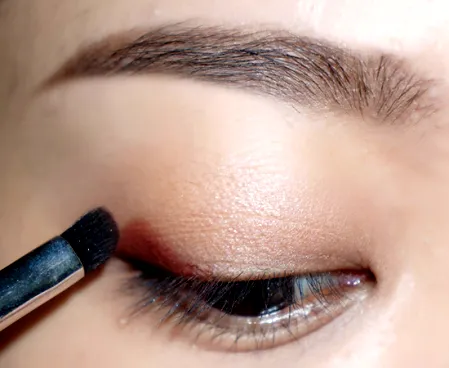 第二步:扁头斜角刷沾取深红棕色眼影,画出眼尾三角。