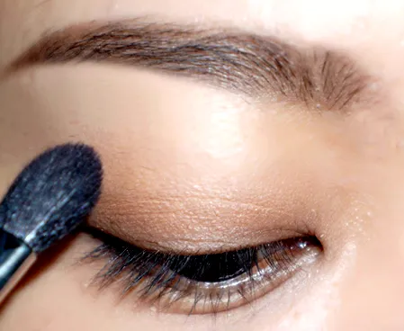 第一步:选择一个哑光浅咖啡色眼影,用一把蓬松的刷子沾取轻扫眼皮,给眼皮做一个整体的打底。