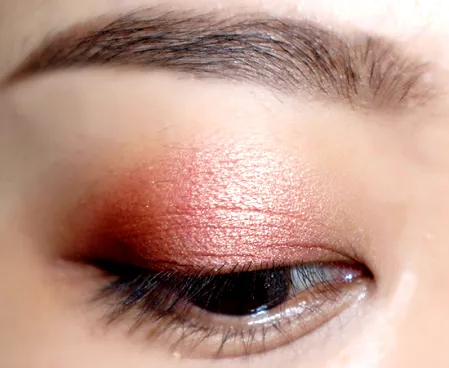 第六步:这个步骤不用刷子,我们用手指沾取珠光色,按压在上眼皮,眼头不用,注意是按压而不是涂抹。