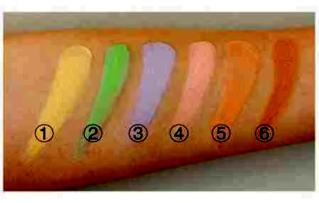 这个遮瑕盘一共有6个颜色,分别是**、绿色、紫色、蜜**、肤色、深肤色。不同的颜色针对不同的瑕疵,**针对提亮,绿色针对泛红的肌肤和痘印,紫色针对暗沉,蜜**针对黑眼圈,肤色针对瑕疵,深肤色针对修容。