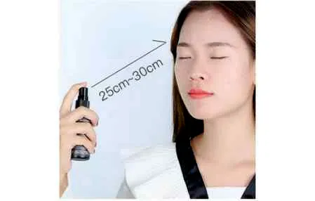 第一步:在使用完粉底液后,将喷雾瓶举到离脸25cm到30cm的地方,然后轻轻按一下喷头,将定妆喷雾均匀的喷到全脸上。