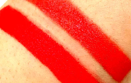MAC vegas volt,以暖皮色号而出名,单看膏体是一个带点橙色调的红色。一看就是个非常提气色的颜色,但涂开后是一个比较浅的颜色,需试色。