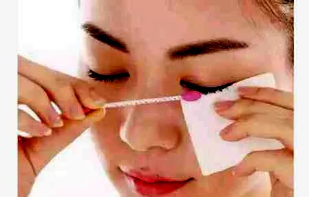 step 3:将卸妆棉对折垫在眼下,眼睛还是要闭着,用一根沾有卸妆油的棉签,从睫毛根部向外将彩妆擦拭到卸妆棉上。