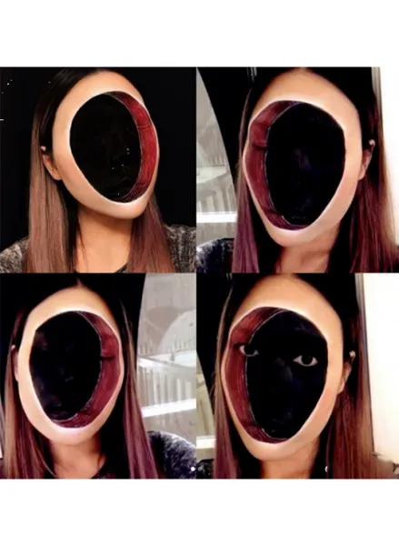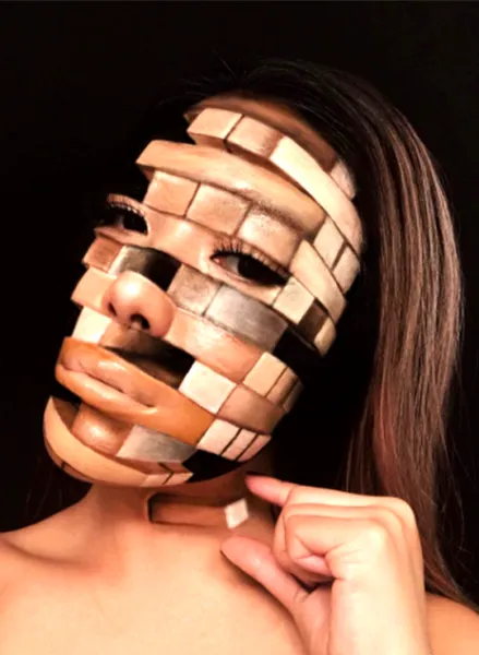 将自己的面部画成墙面的样子,深浅不一的墙面砖头略微有点吓人,但这是利用眼影就能画出的的~建议先使用不显色的眉笔,在面部画出大致轮廓,再用眼影刷沾取眼影或人**绘颜料去填补、晕染。