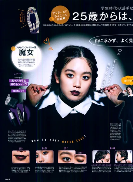 非常复古、具有年代感的一个学生妆容,比起一般的学生妆容,这里加深了立体感以及唇妆,眼妆上加深了下眼影部分,唇妆从自然唇色变成吃小孩色,非常实用的一个万圣节妆容。
