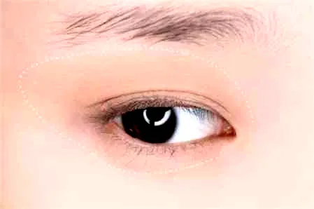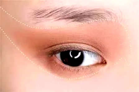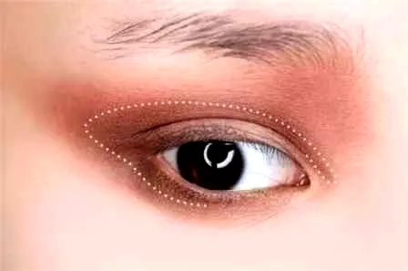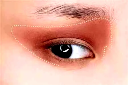 第四步:接着用棕褐色眼影在上眼皮的双眼皮折痕外侧以及下眼尾三角形区域内晕染。