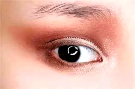 第五步:双眼皮靠近内眼角的2/3段、下眼皮靠近内眼角的1/2段以及内眼角用白色珠光眼影提亮。