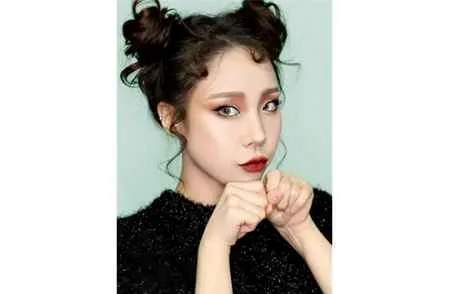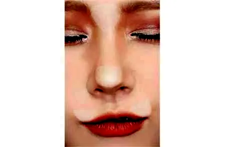 第九步:最后在唇上涂上偏脏橘色的口红,然后在双唇内侧涂上深酒红色口红并自然的向外侧晕染开。