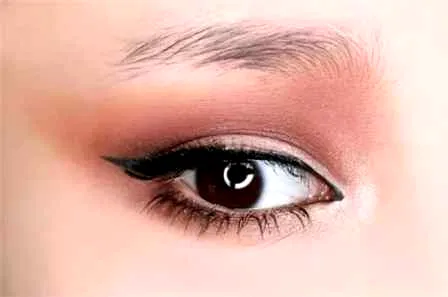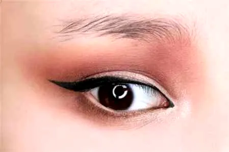第六步:用黑色眼线液笔沿着睫毛根部画一条眼线,眼尾加粗拉长并上扬,内眼角画“>”形眼线,会有“开眼角”的效果,能让眼睛看起来更大。