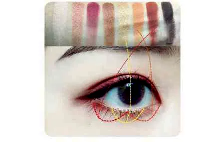 第一步:用中号的眼影刷沾取杏色的眼影涂抹在双眼皮褶的前半部分,图中杏色圈选部分。
