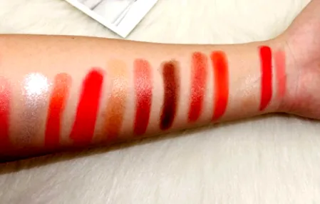 12色的国产眼影盘,暖橘调的流行色。没有雾面打底色或者眼窝晕染色,需要配合其他眼影是这盘眼影的缺点。雾面色每一个都很好晕染,显色度很高,品质都很好。珠光色就不太尽如人意,亮片有些大,刷具不好取粉。