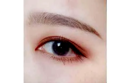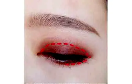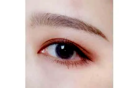 第二步:用眼影刷沾取02红豆铺满双眼皮褶皱,并慢慢向眼窝处晕染,注意要少量多次,不要急。用刷子上的余粉带过下眼尾。